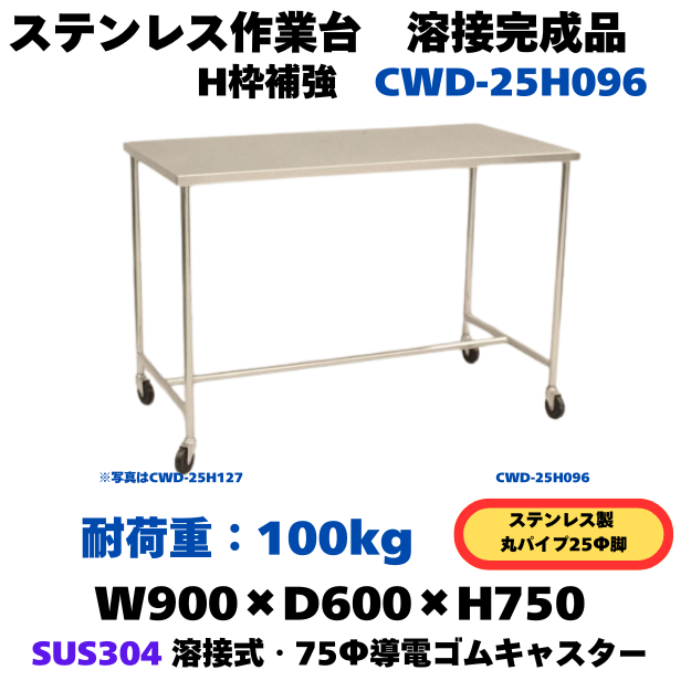 【CWD-25H096】ステンレス作業台/溶接完成品・H枠補強・75Φ導電ゴムキャスター/丸パイプ25Φ脚 耐荷重100kg SUS304 W900×D600×H750