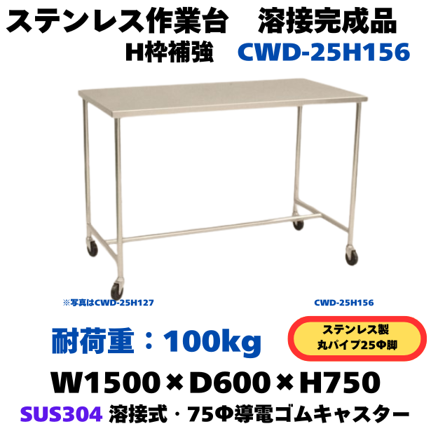 【CWD-25H156】ステンレス作業台/溶接完成品・H枠補強・75Φ導電ゴムキャスター/丸パイプ25Φ脚 耐荷重100kg SUS304 W1500×D600×H750