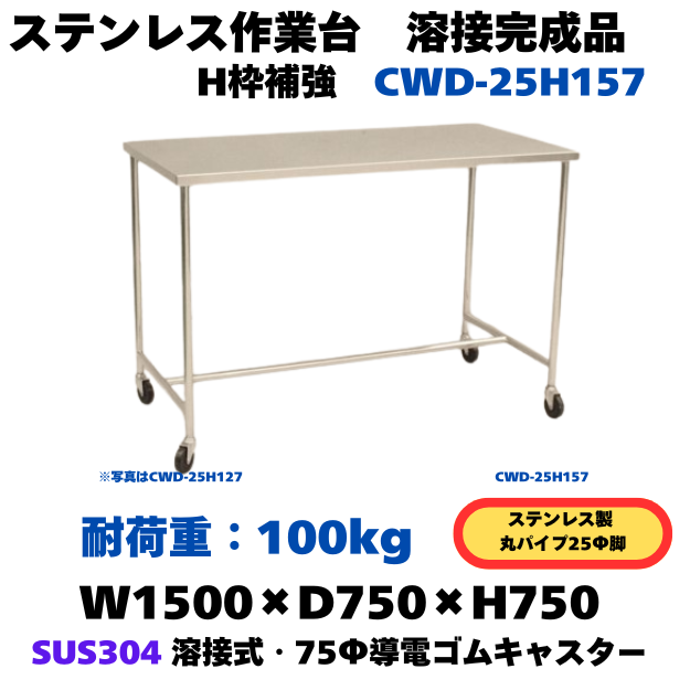 【CWD-25H157】ステンレス作業台/溶接完成品・H枠補強・75Φ導電ゴムキャスター/丸パイプ25Φ脚 耐荷重100kg SUS304 W1500×D750×H750