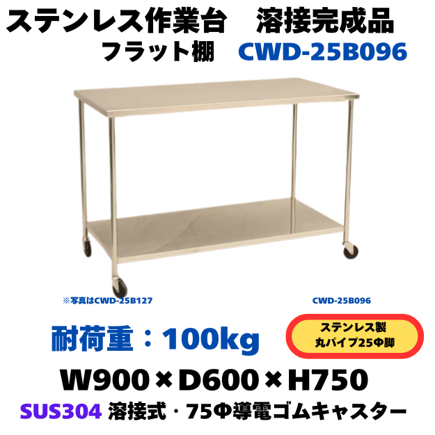 【CWD-25B096】ステンレス作業台/溶接完成品・フラット棚・75Φ導電ゴムキャスター/丸パイプ25Φ脚 耐荷重100kg SUS304 W900×D600×H750