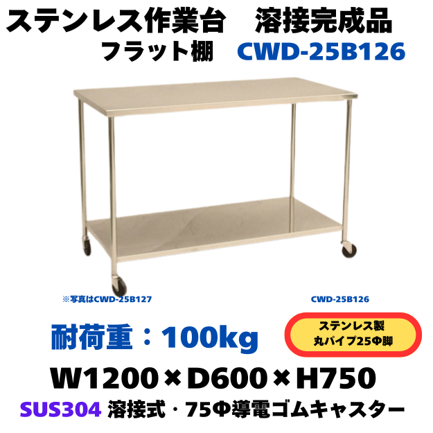 【CWD-25B126】ステンレス作業台/溶接完成品・フラット棚・75Φ導電ゴムキャスター/丸パイプ25Φ脚 耐荷重100kg SUS304 W1200×D600×H750