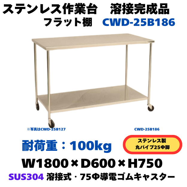 【CWD-25B186】ステンレス作業台/溶接完成品・フラット棚・75Φ導電ゴムキャスター/丸パイプ25Φ脚 耐荷重100kg SUS304 W1800×D600×H750
