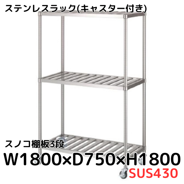 【CWD-RB387C】ステンレスラック スノコ棚板 3段 キャスター付き SUS430 W1800*D750*H1800