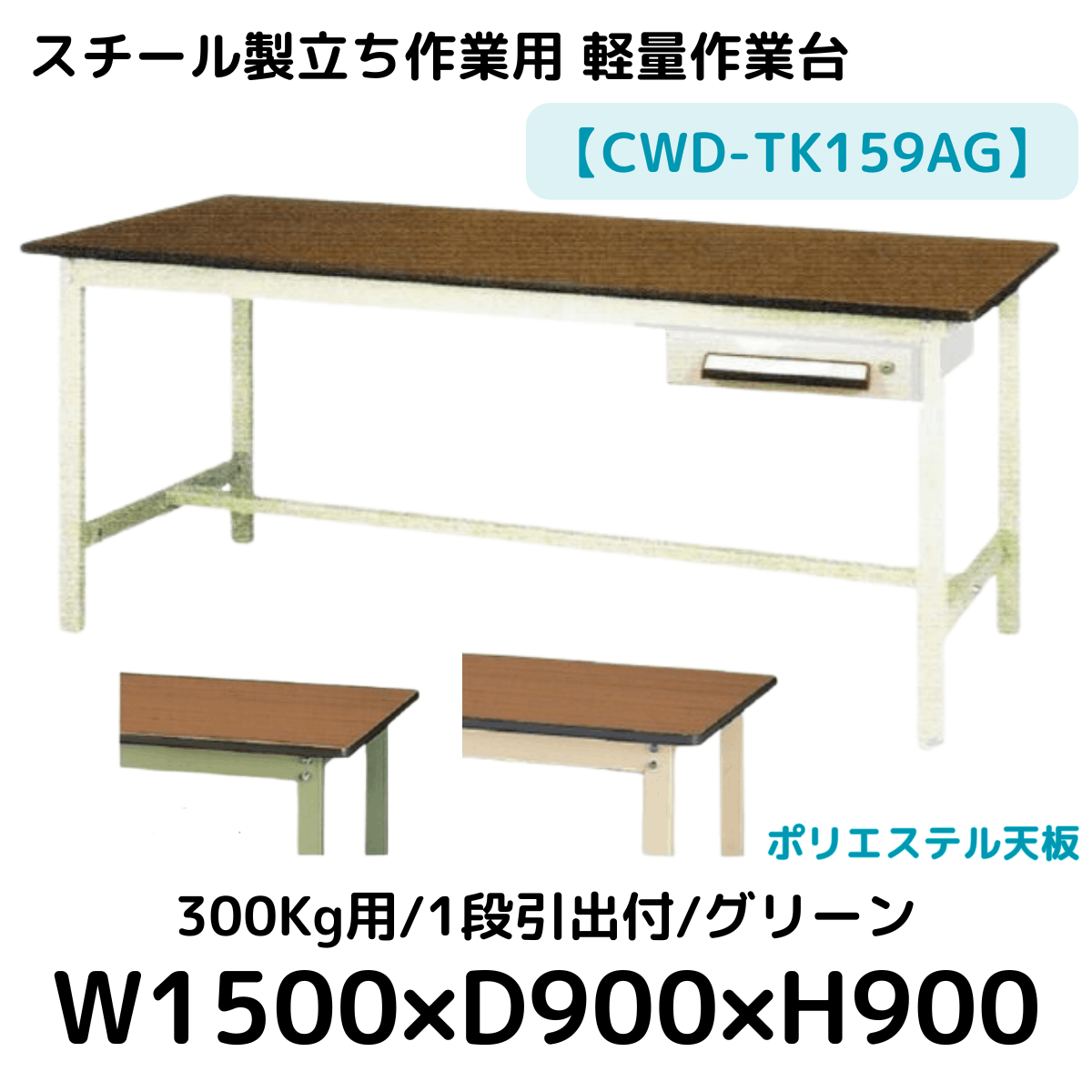 【CWD-TK159AG】スチール製立ち作業台(グリーン) 1段引き出し付き 300kg用 ポリエステル天板 W1500*D900*H900