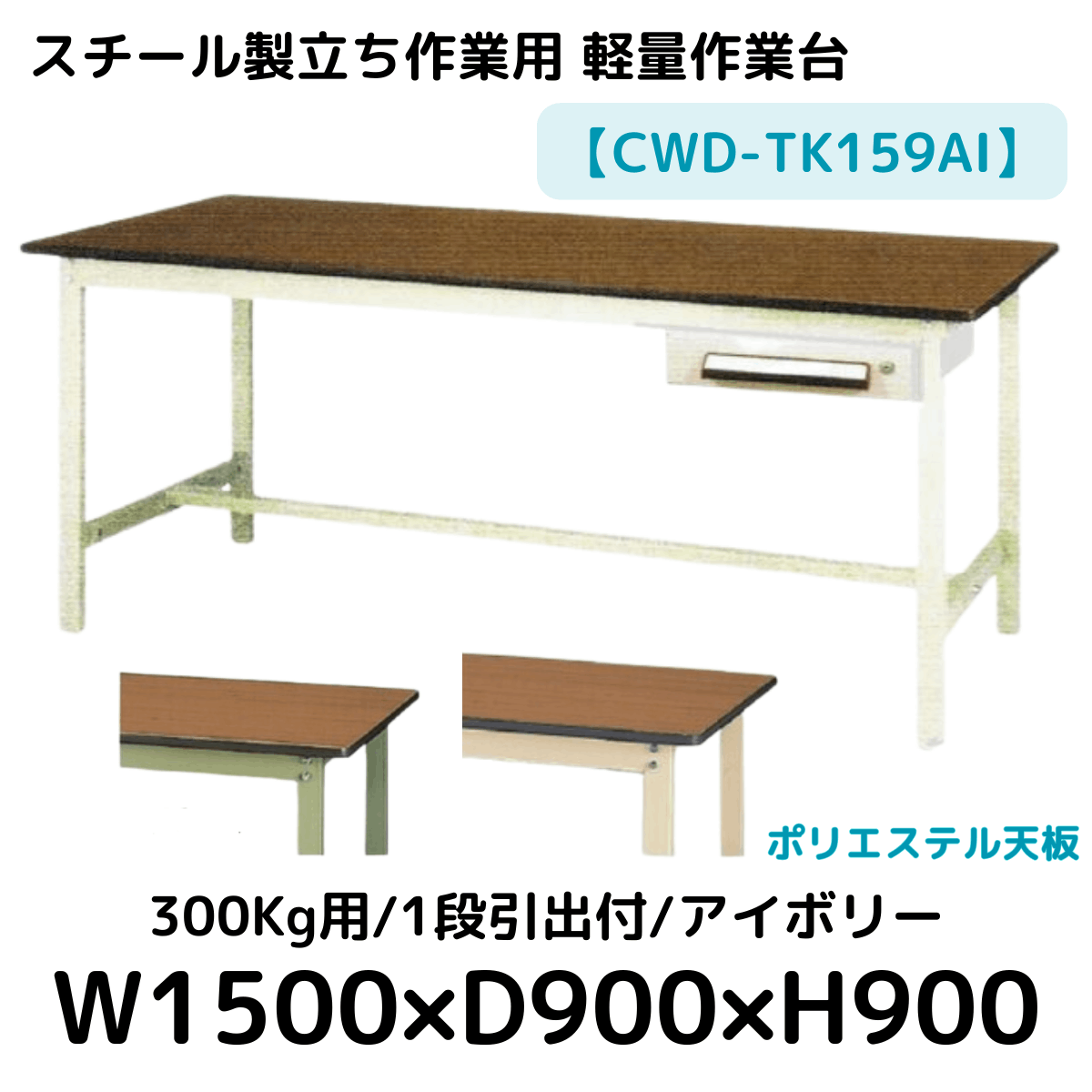 【CWD-TK159AI】スチール製立ち作業台(アイボリー) 1段引き出し付き 300kg用 ポリエステル天板 W1500*D900*H900