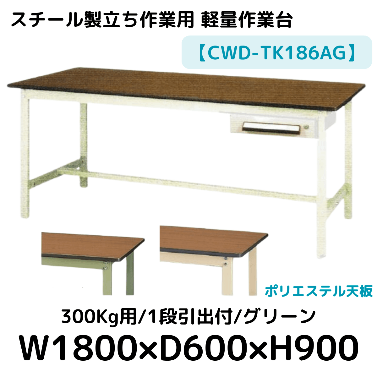 【CWD-TK186AG】スチール製立ち作業台(グリーン) 1段引き出し付き 300kg用 ポリエステル天板 W1800*D600*H900
