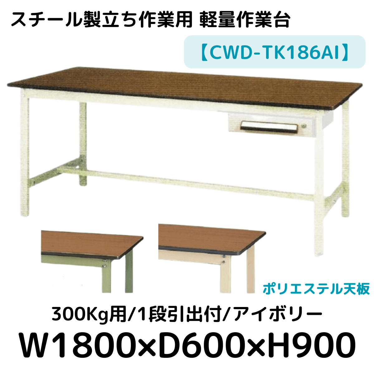 【CWD-TK186AI】スチール製立ち作業台(アイボリー) 1段引き出し付き 300kg用 ポリエステル天板 W1800*D600*H900