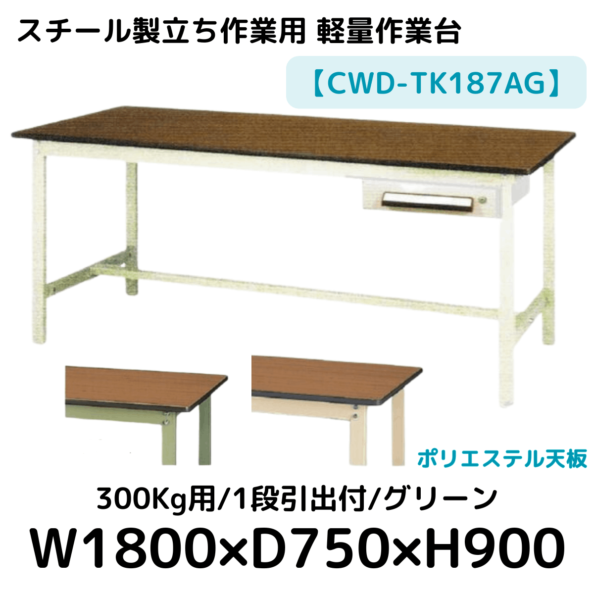 【CWD-TK187AG】スチール製立ち作業台(グリーン) 1段引き出し付き 300kg用 ポリエステル天板 W1800*D750*H900