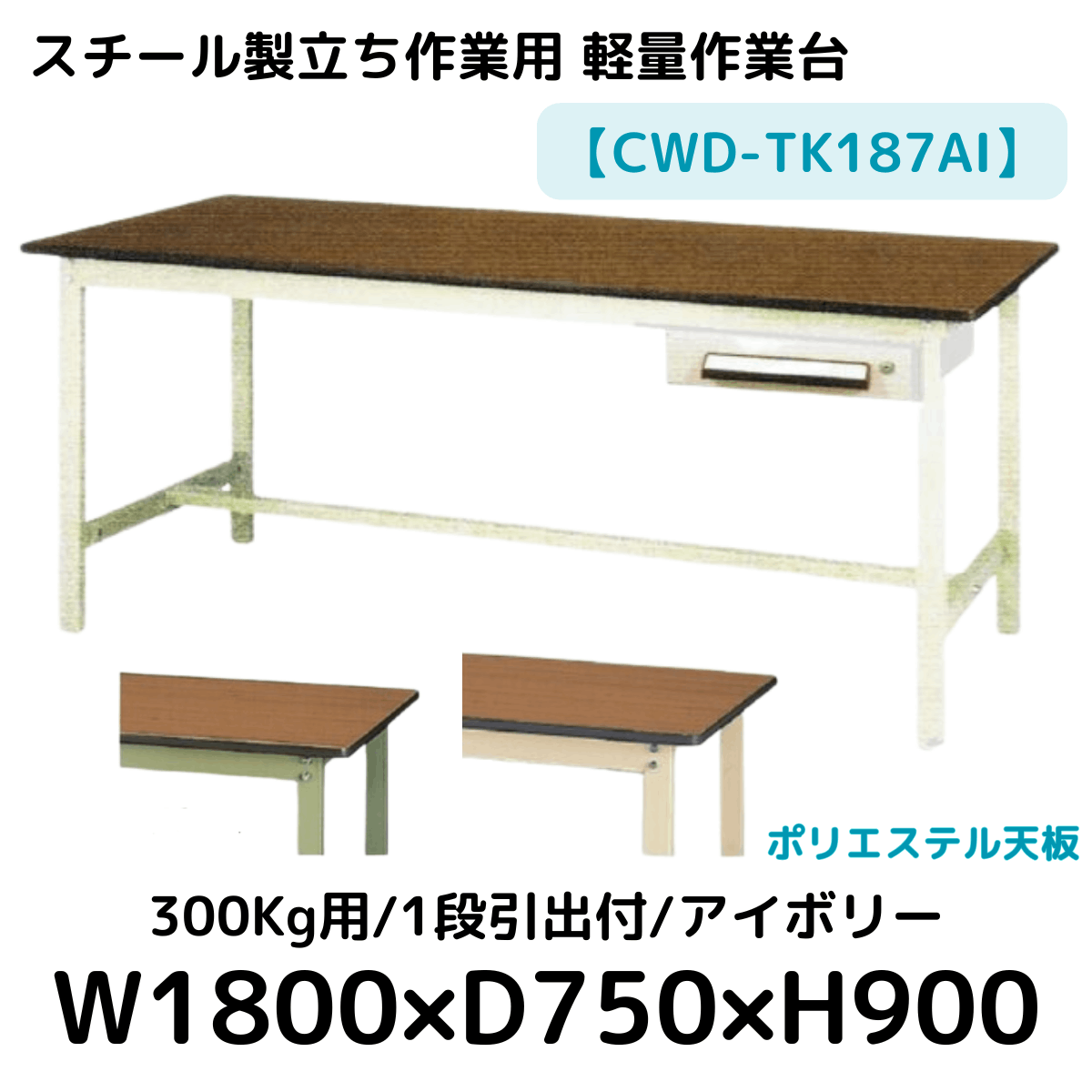 【CWD-TK187AI】スチール製立ち作業台(アイボリー) 1段引き出し付き 300kg用 ポリエステル天板 W1800*D750*H900