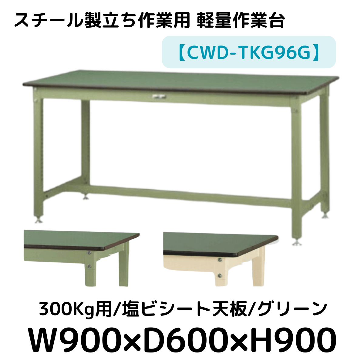 【CWD-TKG96G】スチール製立ち作業台(グリーン) 300kg用 塩ビシート天板 W900*D600*H900