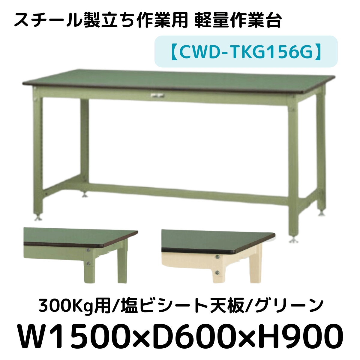 【CWD-TKG156G】スチール製立ち作業台(グリーン) 300kg用 塩ビシート天板 W1500*D600*H900