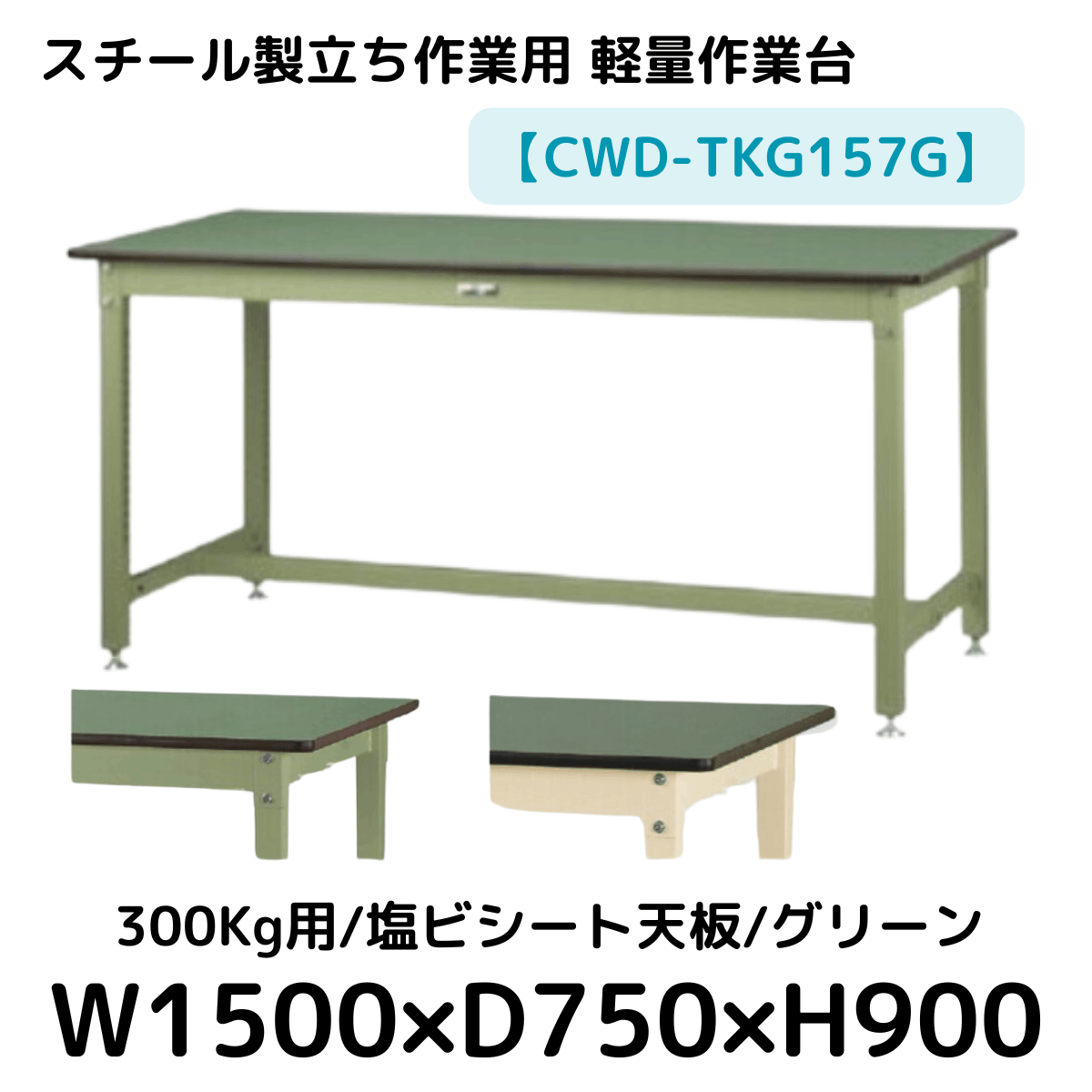 【CWD-TKG157I】スチール製立ち作業台(グリーン×アイボリー) 300kg用 塩ビシート天板 W1500*D750*H900