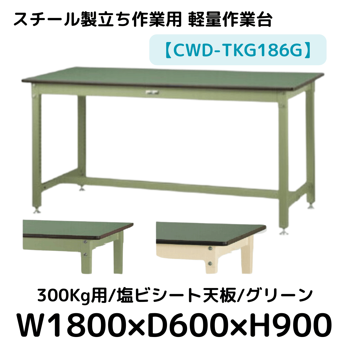 【CWD-TKG186I】スチール製立ち作業台(グリーン×アイボリー) 300kg用 塩ビシート天板 W1800*D600*H900