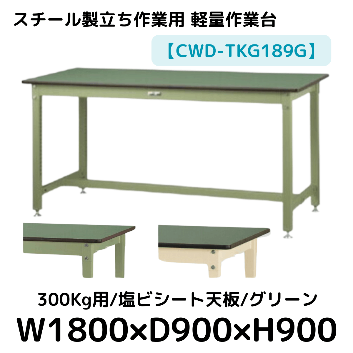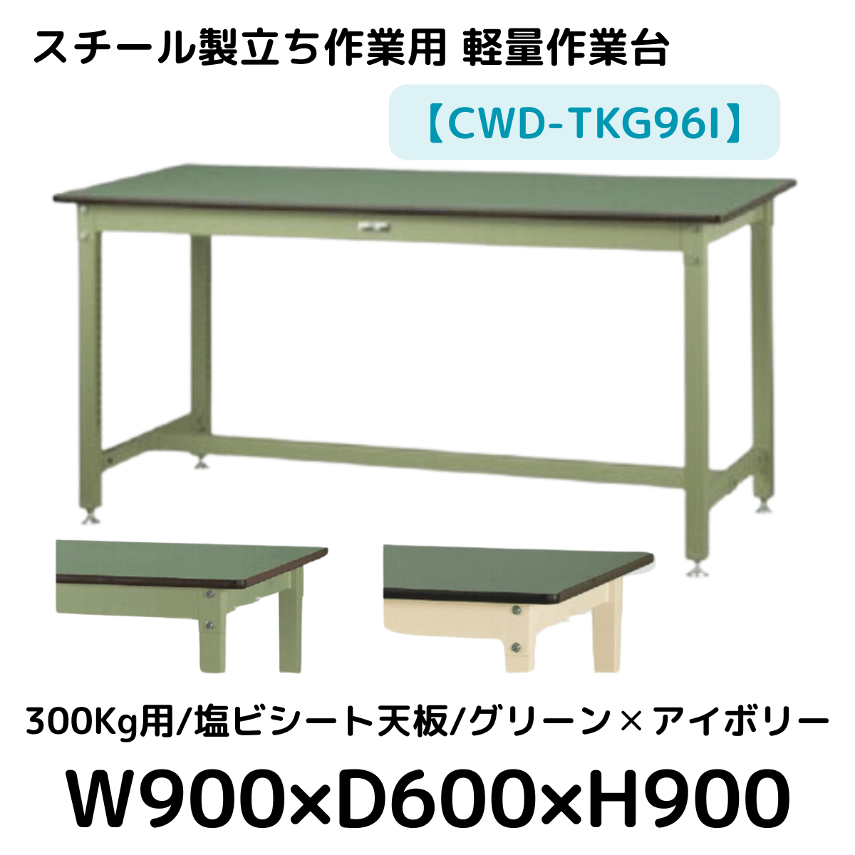 【CWD-TKG96I】スチール製立ち作業台(グリーン×アイボリー) 300kg用 塩ビシート天板 W900*D600*H900