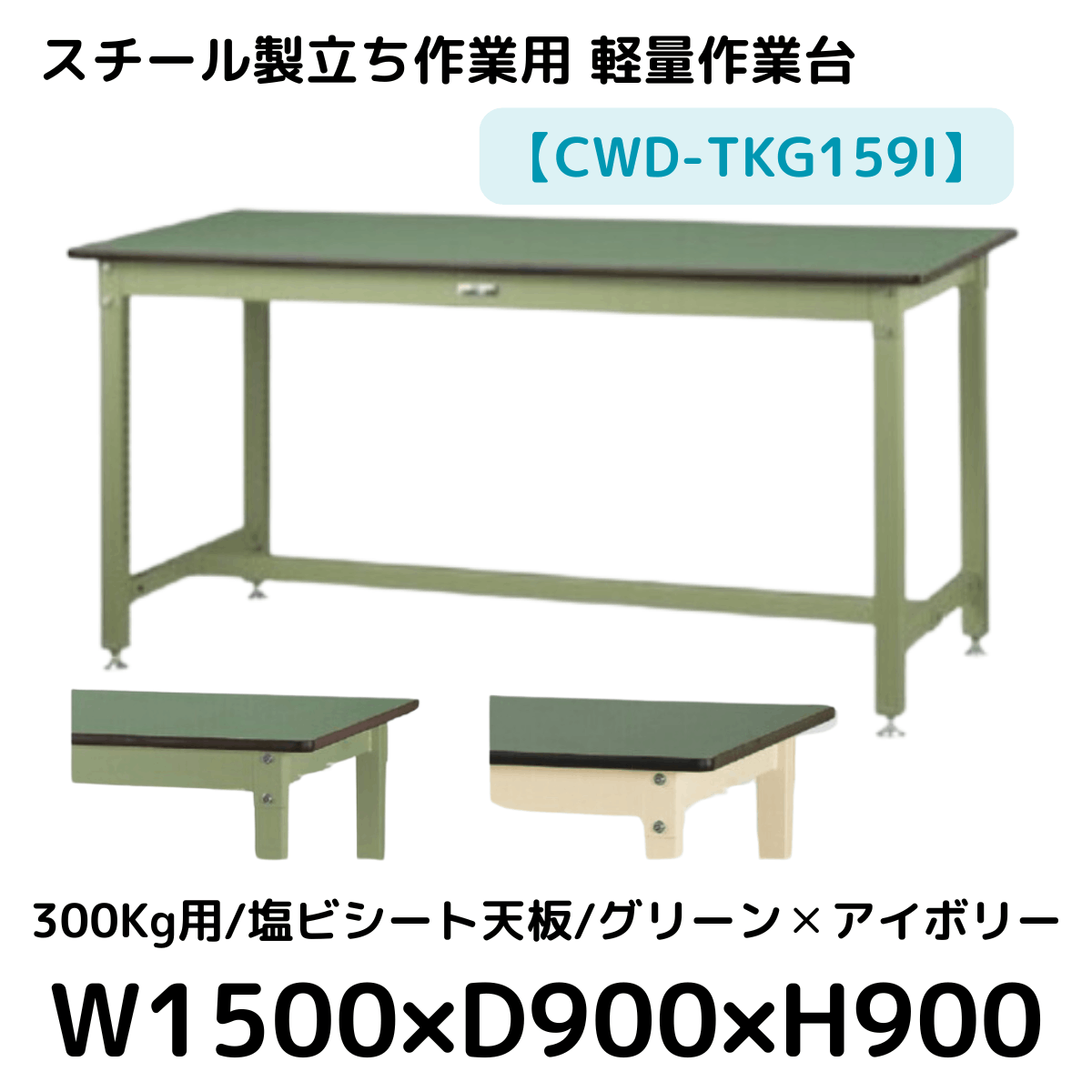 【CWD-TKG159I】スチール製立ち作業台(グリーン×アイボリー) 300kg用 塩ビシート天板 W1500*D900*H900