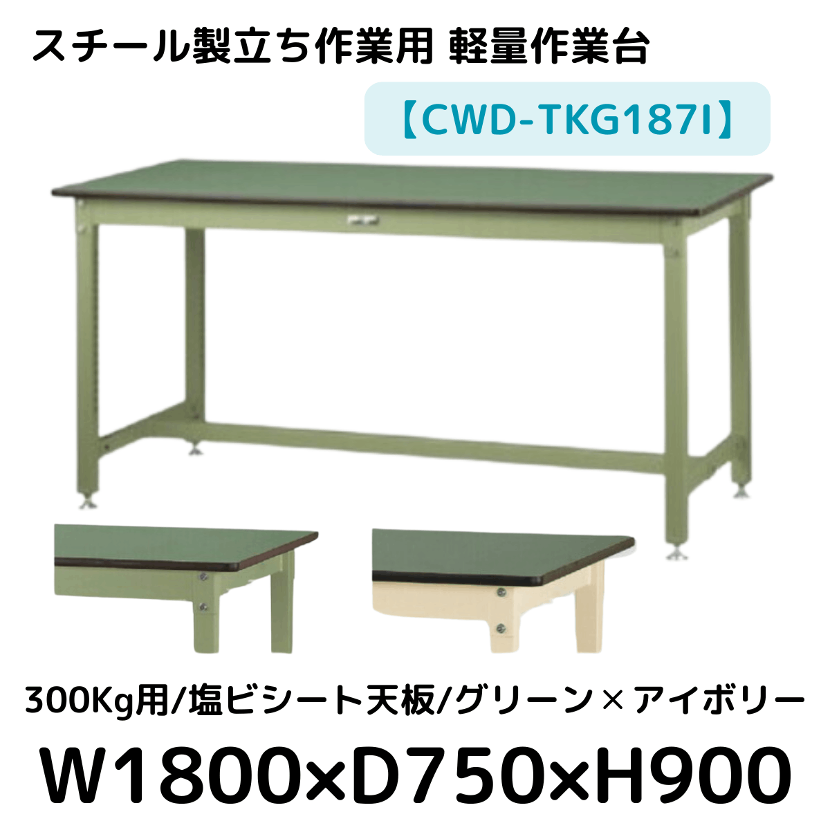 【CWD-TKG187I】スチール製立ち作業台(グリーン×アイボリー) 300kg用 塩ビシート天板 W1800*D750*H900