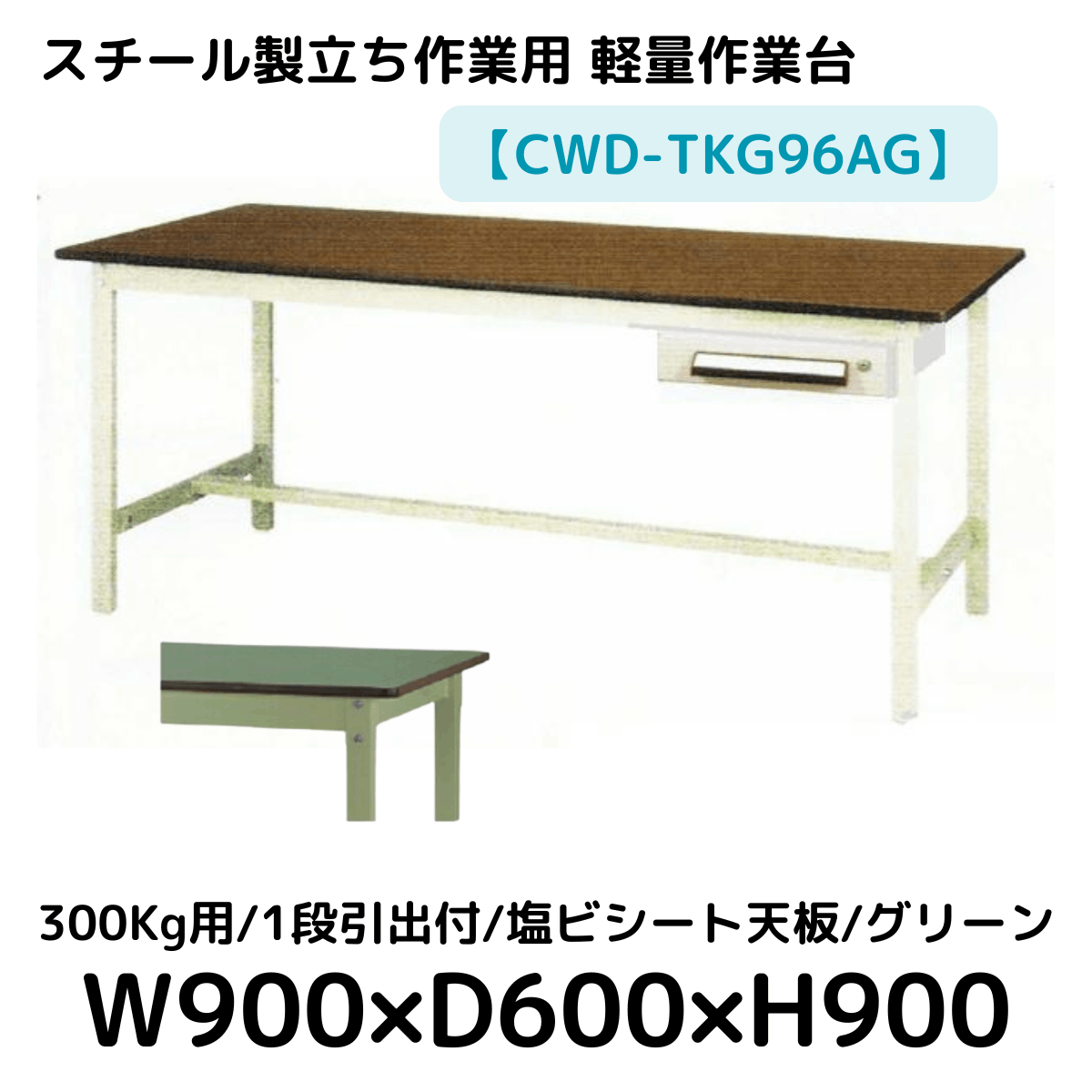 【CWD-TKG96AG】スチール製立ち作業台(グリーン) 300kg用 塩ビシート天板 1段引き出し付き W900*D600*H900