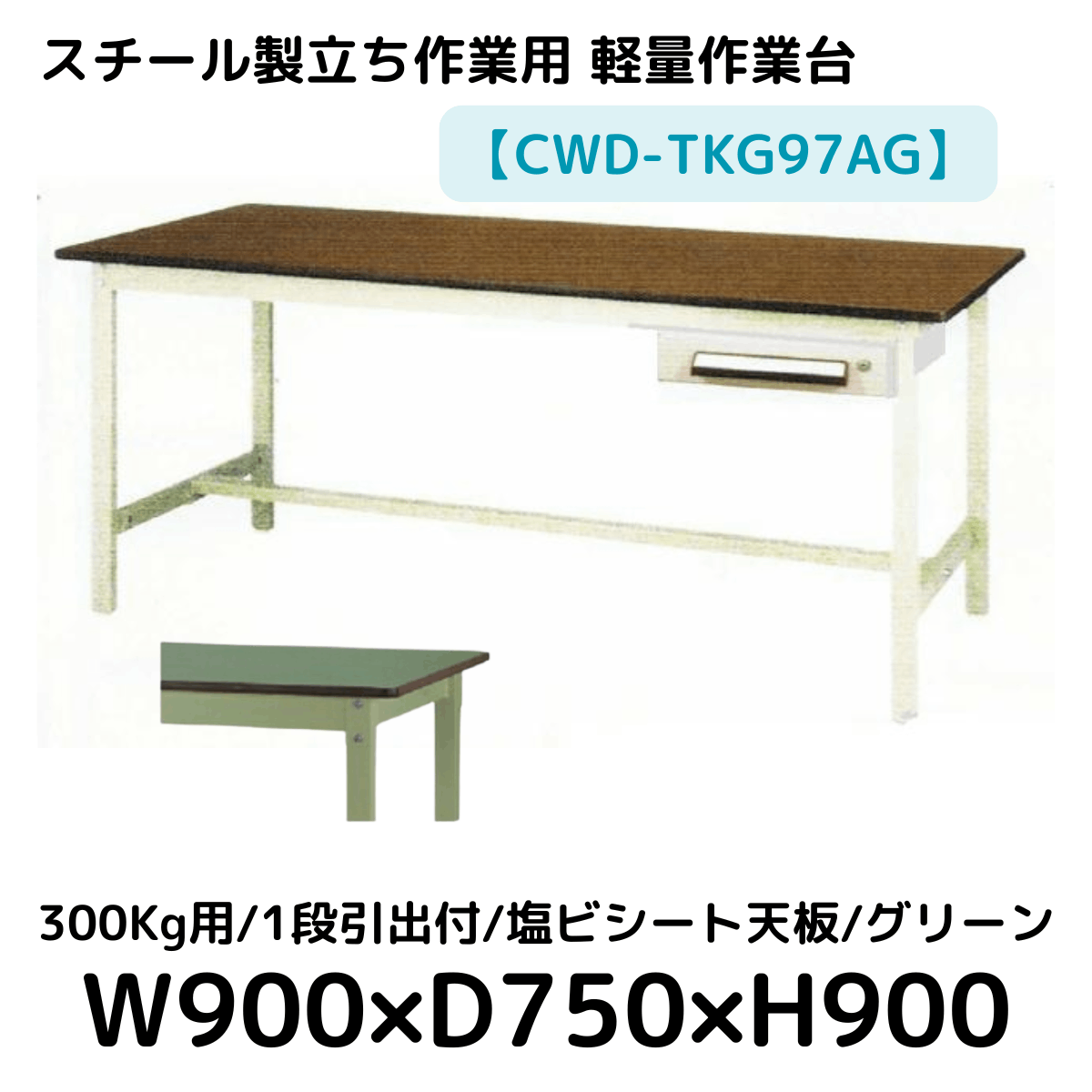 【CWD-TKG97AG】スチール製立ち作業台(グリーン) 300kg用 塩ビシート天板 1段引き出し付き W900*D750*H900