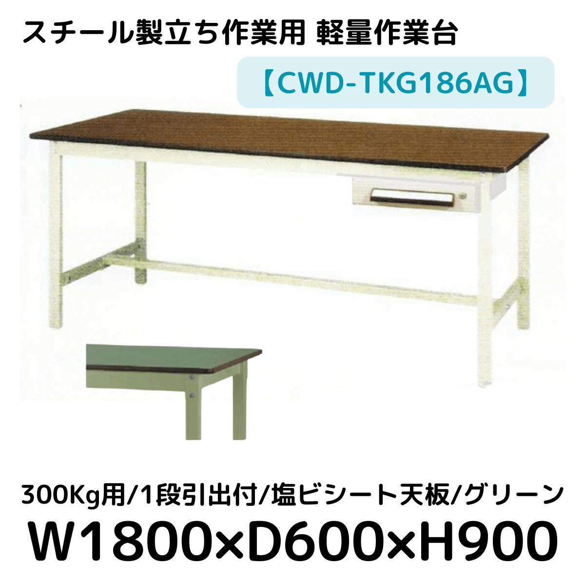 【CWD-TKG186AG】スチール製立ち作業台(グリーン) 300kg用 塩ビシート天板 1段引き出し付き W1800*D600*H900