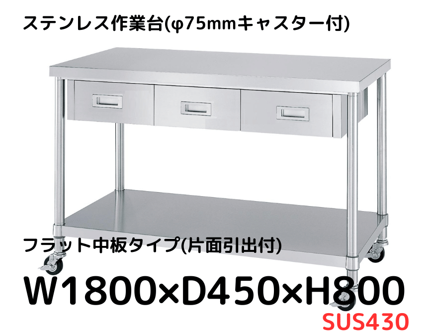 【CWD-SA84KC】ステンレス作業台 75mmキャスター付 フラット天板(フラット棚) 片面引出付き SUS430 W1800*D450*H800