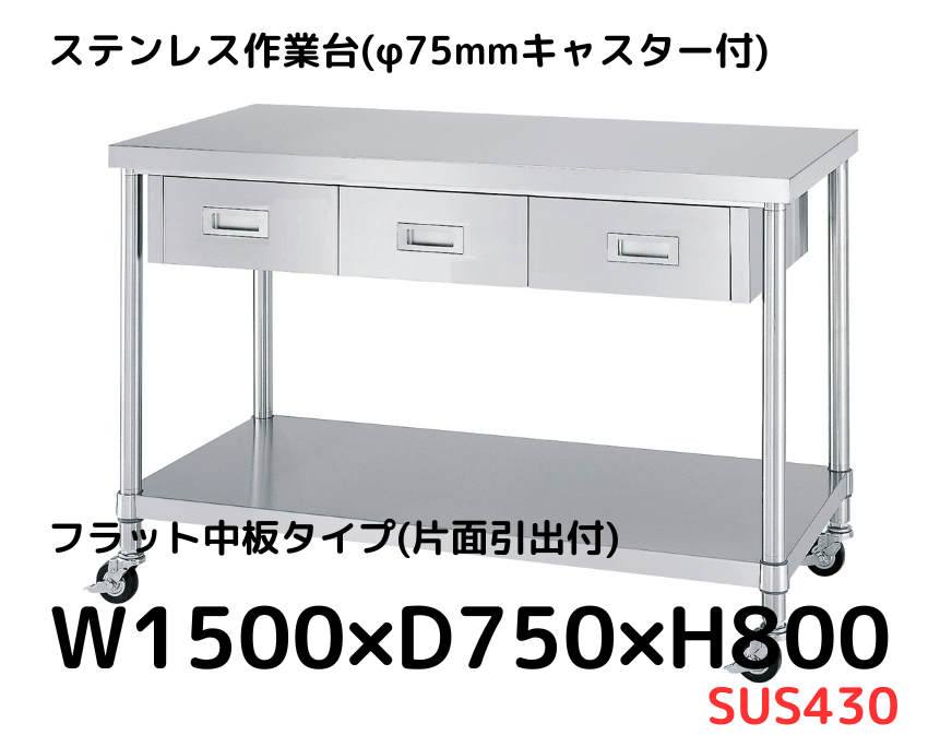 【CWD-SA57KC】ステンレス作業台 75mmキャスター付 フラット天板(フラット棚) 片面引出付き SUS430 W1500*D750*H800