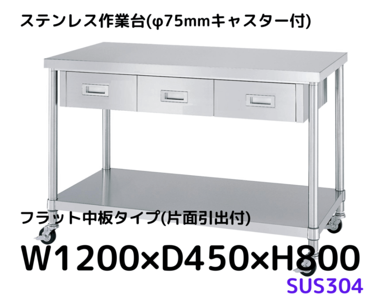 【CWD-QSA24KC】ステンレス作業台 75mmキャスター付 フラット天板(フラット棚) 片面引出付き SUS304 W1200*D450*H800