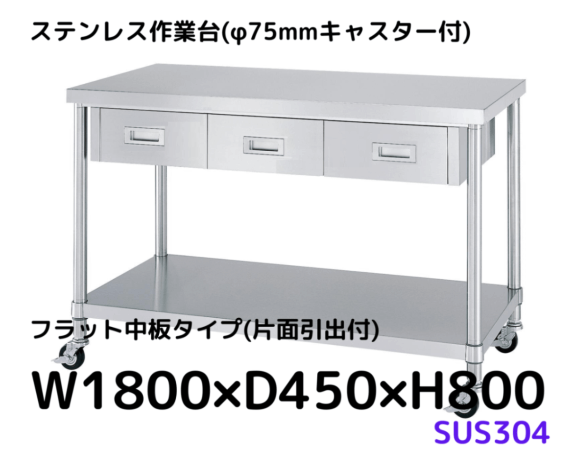 【CWD-QSA84KC】ステンレス作業台 75mmキャスター付 フラット天板(フラット棚) 片面引出付き SUS304 W1800*D450*H800