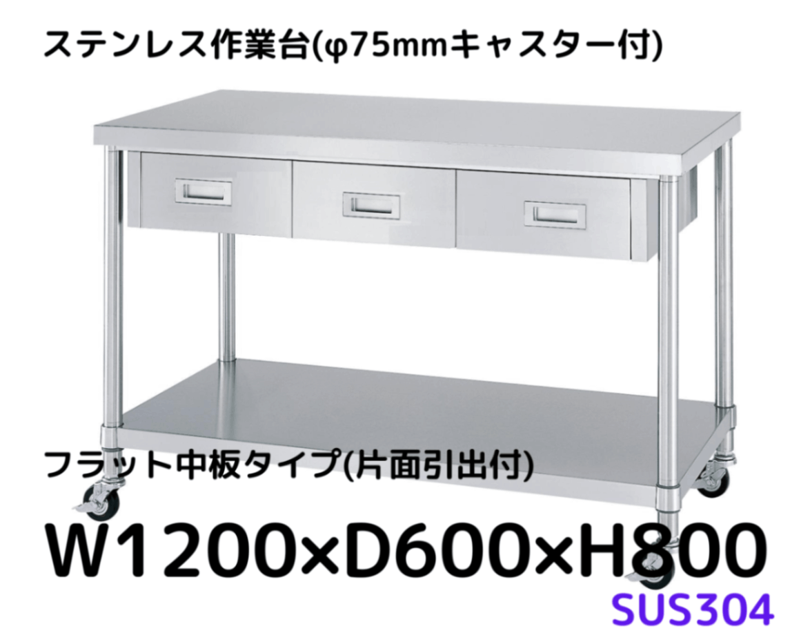 【CWD-QSA26KC】ステンレス作業台 75mmキャスター付 フラット天板(フラット棚) 片面引出付き SUS304 W1200*D600*H800