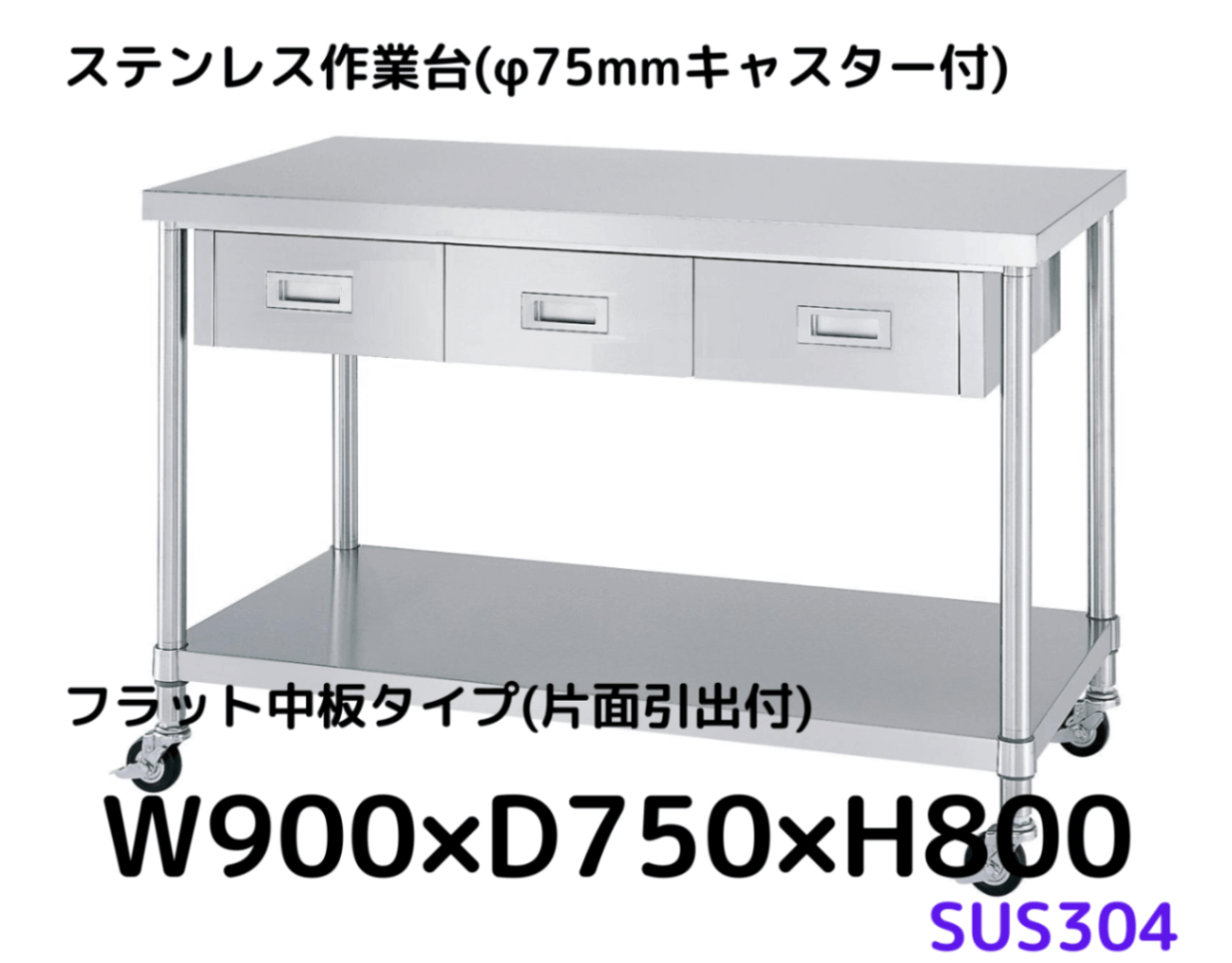【CWD-QSA94KC】ステンレス作業台 75mmキャスター付 フラット天板(フラット棚) 片面引出付き SUS304 W900*D450*H800