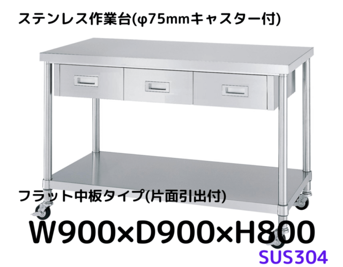 【CWD-QSA99KC】ステンレス作業台 75mmキャスター付 フラット天板(フラット棚) 片面引出付き SUS304 W900*D900*H800