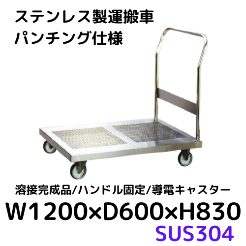 【CWD-P126D】ステンレス製運搬車/ハンドル固定・パンチング仕様 導電キャスター SUS304 W1200×D600×H830